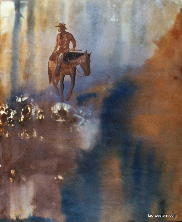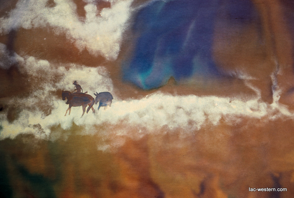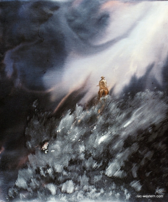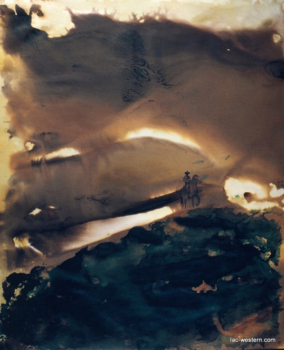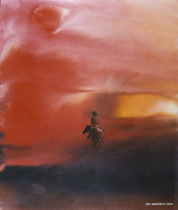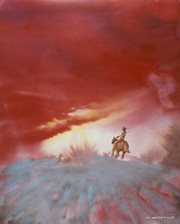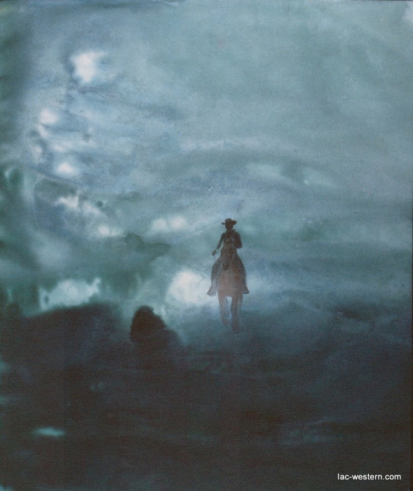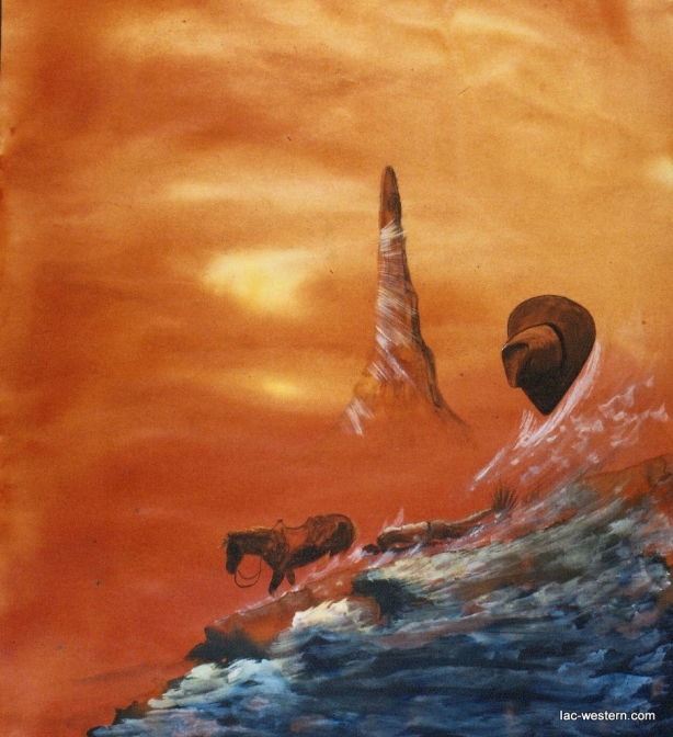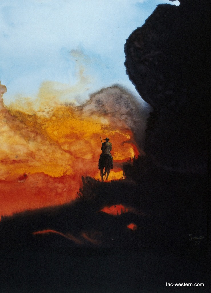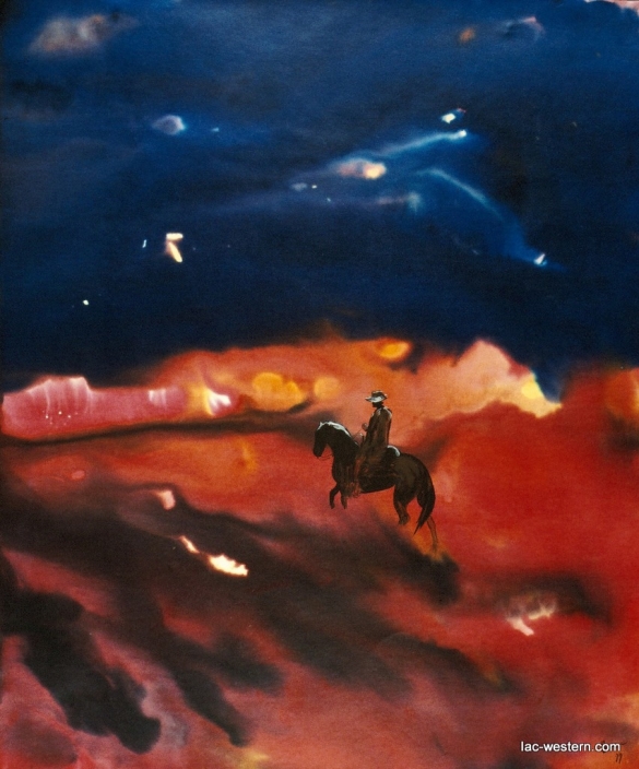 Les premières oeuvres concernent le travail des encres et la recherche chromatique autour d'un paysage onirique et du cow-boy solitaire.